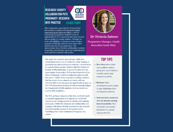 When university researcher Dr Victoria (Tori) Salmon built a collaboration between Health Innovation South West and WILD, a charity supporting young parent families, it was an opportunity for her research to feel more relevant and accessible for young mothers. Through her work with APPEAL, an evidence-based training programme helping midwives teach pelvic floor muscle exercises during pregnancy, Tori demonstrates how effective collaboration between researchers and charities can be an important path that transforms research into action.